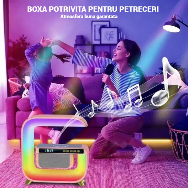 Lampa RGB, boxa Bluetooth, difuzor 5W, incarcare wireless,ceas digital cu alarma, lumini ambiental